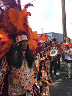 Today was Super Sunday in New Orleans = black communities form tribes and elect chiefs who are men that make elaborate Indian chief costumes and parade down the streets. Top pic is Linh standing in front of one of the chief's costumes.